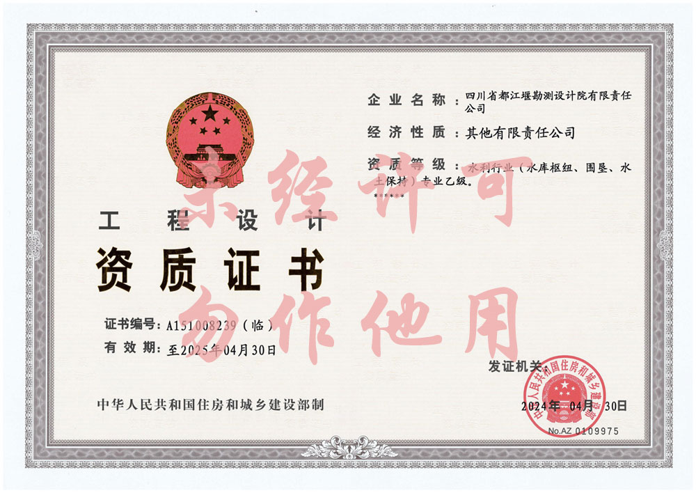 四川省都江堰勘測設(shè)計(jì)院有限責(zé)任公司是一家專業(yè)從事水利水電工程勘察設(shè)計(jì)的專業(yè)甲級設(shè)計(jì)院,目前具有水利行業(yè)(灌溉排澇)專業(yè)甲級、水利行業(yè)(引調(diào)水、河道整治、城市防洪)專業(yè)乙級、電力行業(yè)(水力發(fā)電(含抽水蓄能、潮汐))專業(yè)乙級、市政行業(yè)(道路工程、橋梁工程)專業(yè)乙級、水利行業(yè)(水庫樞紐、圍墾、水土保持)專業(yè)丙級設(shè)計(jì)資質(zhì)、工程勘察專業(yè)類(巖土工程、水文地質(zhì)、工程測量)乙級資質(zhì)和水利工程咨詢、項(xiàng)目管理丙級資質(zhì),通過了ISO9001:2008質(zhì)量體系國際標(biāo)準(zhǔn)認(rèn)證。 通過30多年的發(fā)展,公司已經(jīng)擁有一支愛崗敬業(yè)、專業(yè)精湛、分工明確、協(xié)作配合的專業(yè)技術(shù)隊(duì)伍和高水平的顧問團(tuán)隊(duì),有完善的組織機(jī)構(gòu)、優(yōu)秀的管...